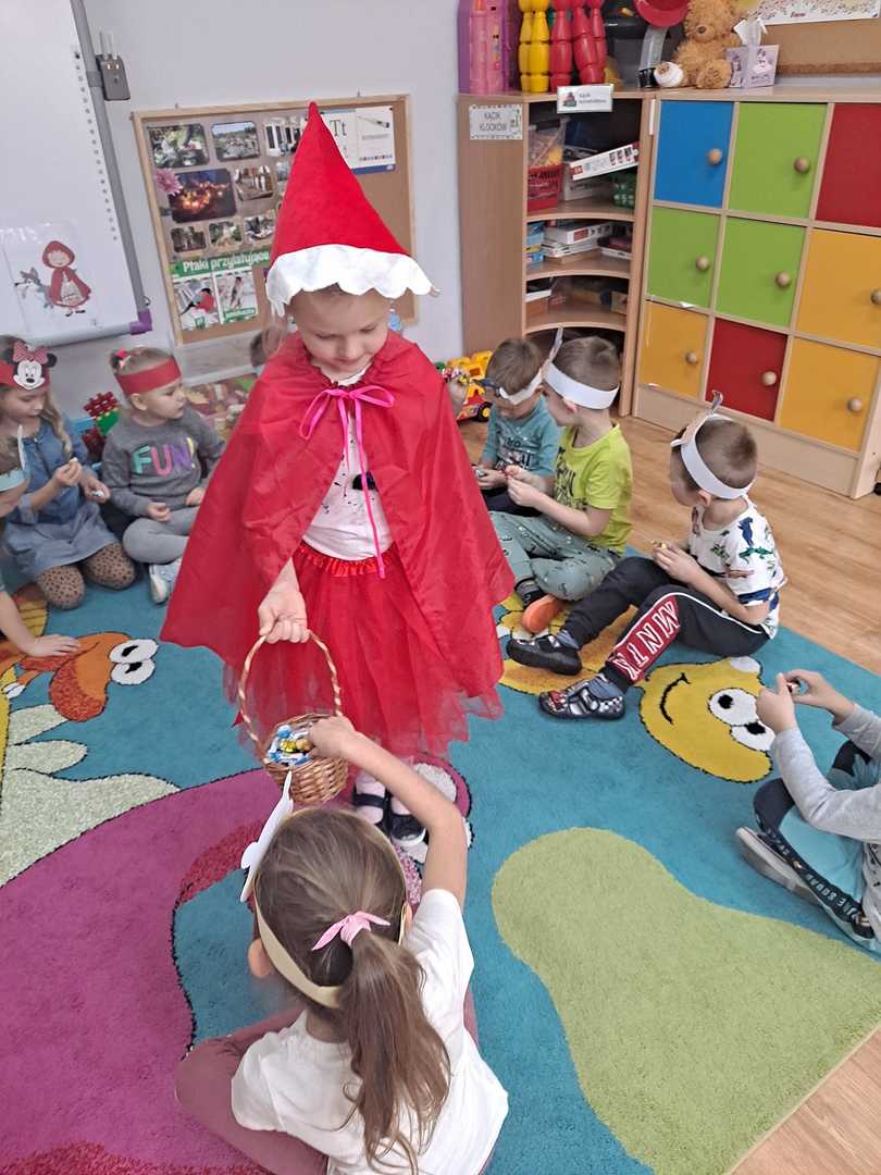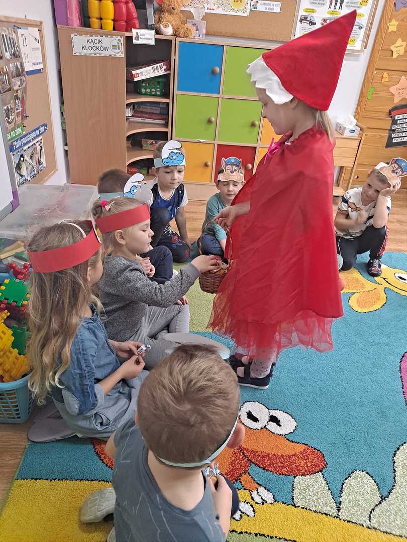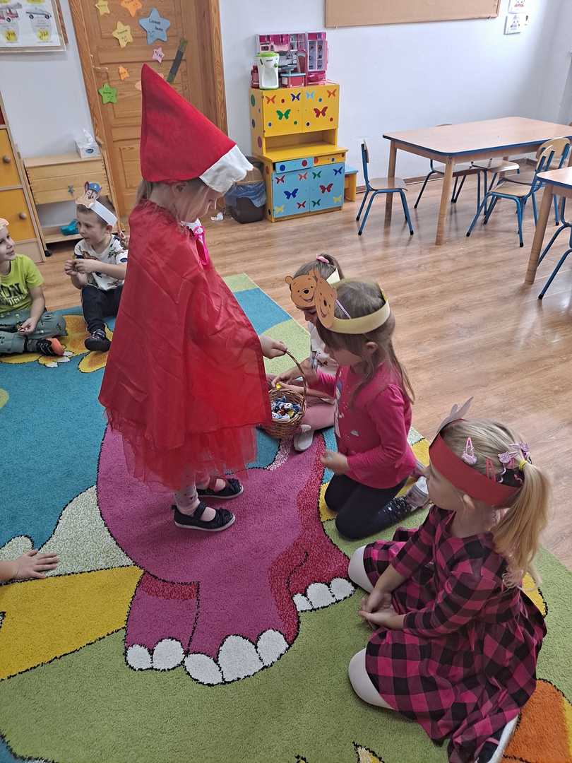 Odwiedziła nas również Wróżka z Czerwonym Kapturkiem przynosząc dzieciom kilka zadań do wykonania, aby pomogli Jej wrócić do bajki. Przedszkolaki zadania wykonały, nagrodę otrzymały, a Wróżka wróciła do swojej bajki.