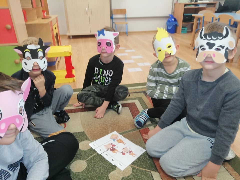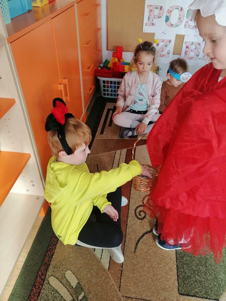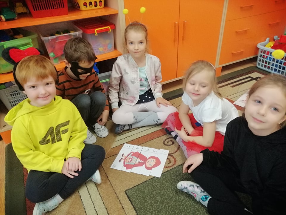 Pani wróżka przyniosła dzieciom zadania do wykonania: odgadywanie zagadek, puzzli, dopasowywanie elementów oraz zabawy z udziałem bajkowych postaci.