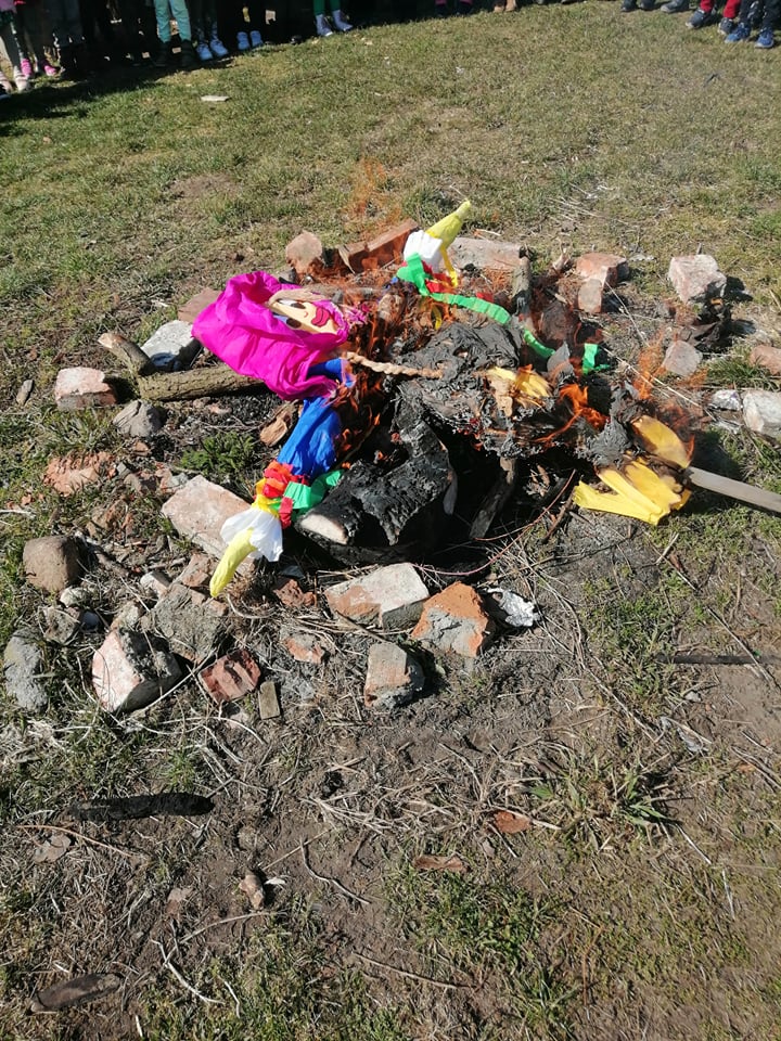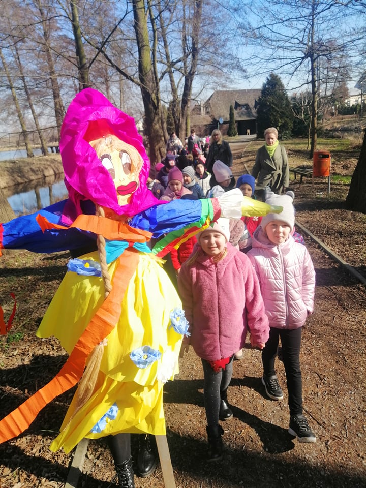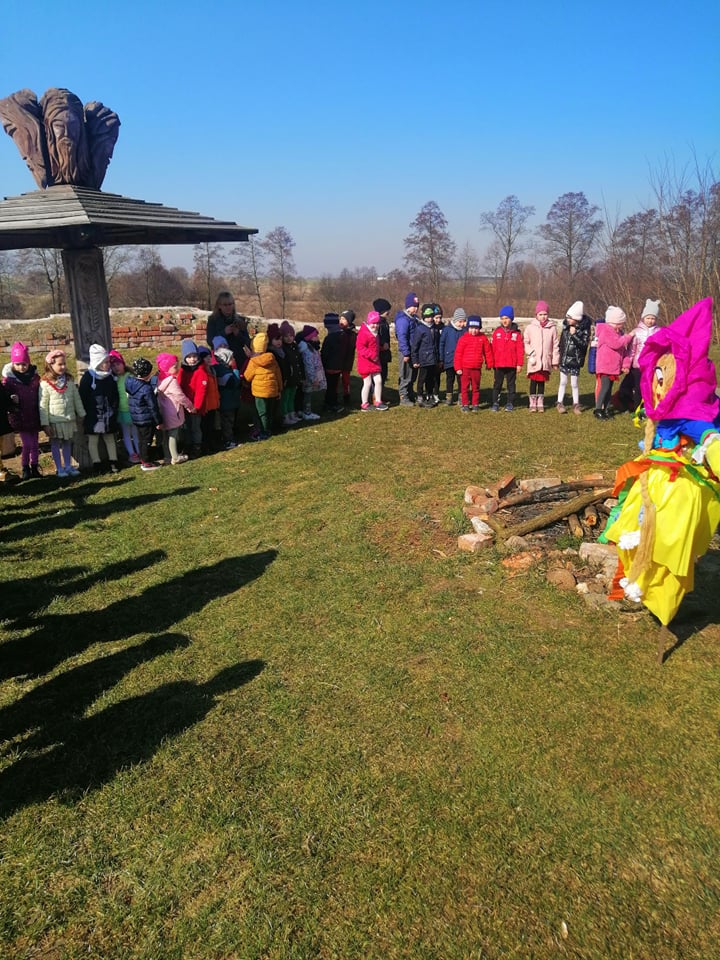 Następnie wszystkie grupy wyszły na spacer aby pożegnać Marzannę - zimową pannę, a powitać śpiewem i wierszykami panią Wiosnę.