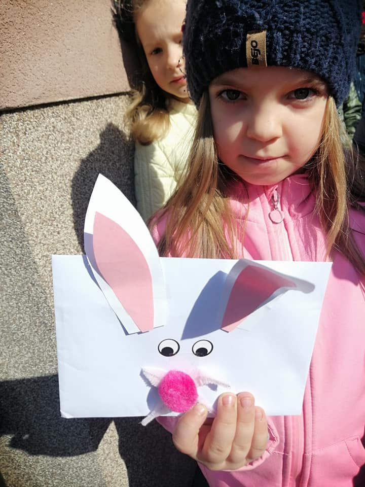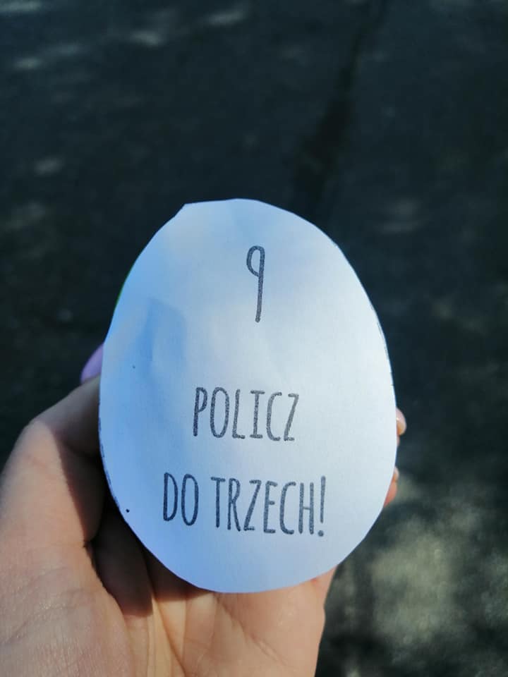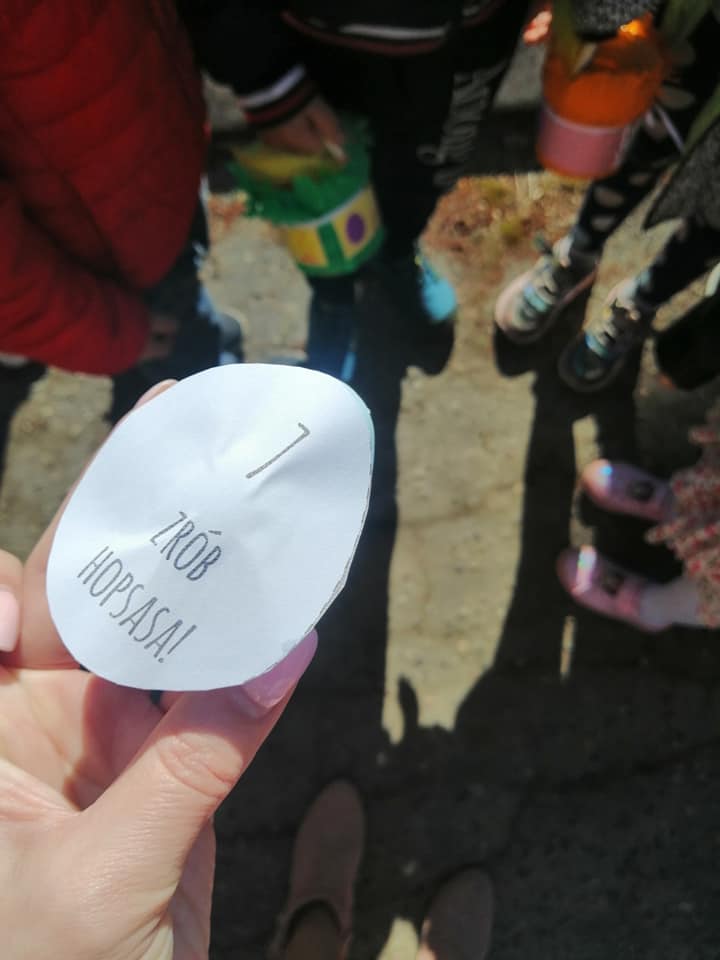 Zostawił dla nas list z zadaniami, które ukrył w jajeczkach w okolicy. Dzieci musiały odkryć gdzie jajeczka się schowały i wykonać zadania. Było wiele zadań:ćwiczenia, liczenie, udawanie kurki itp.
