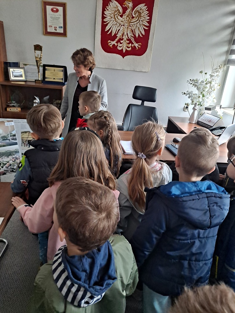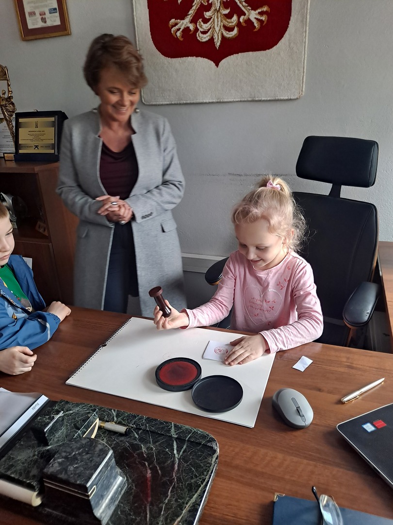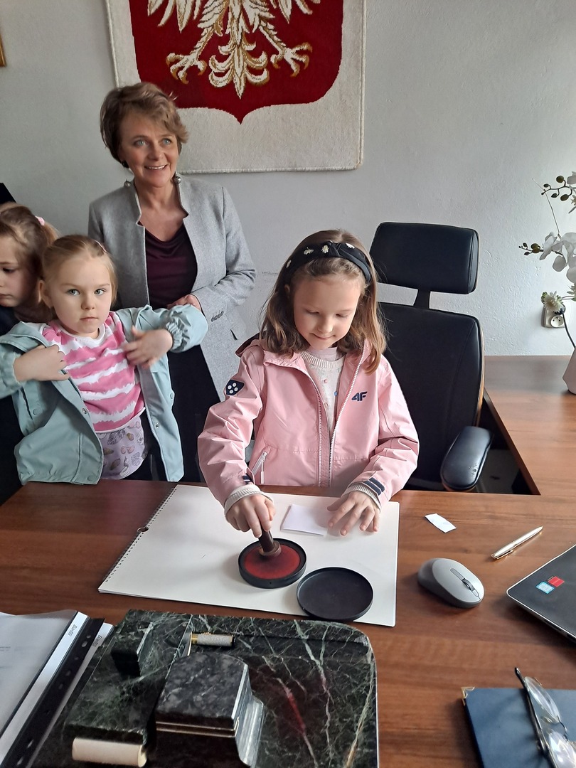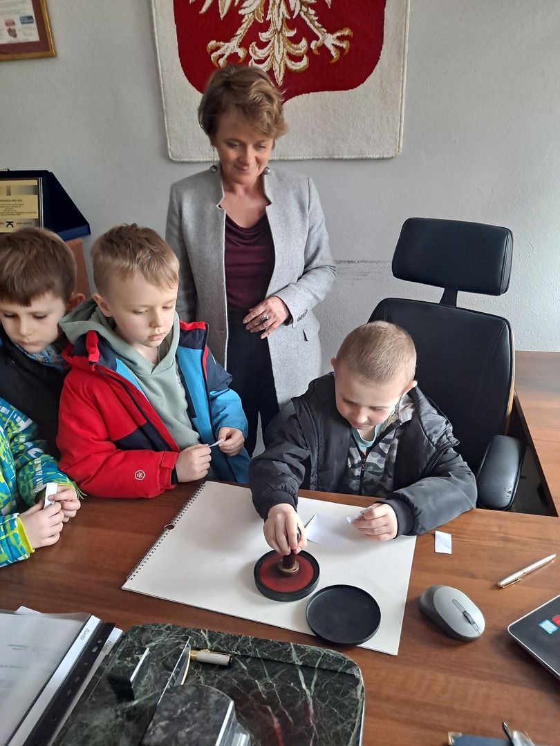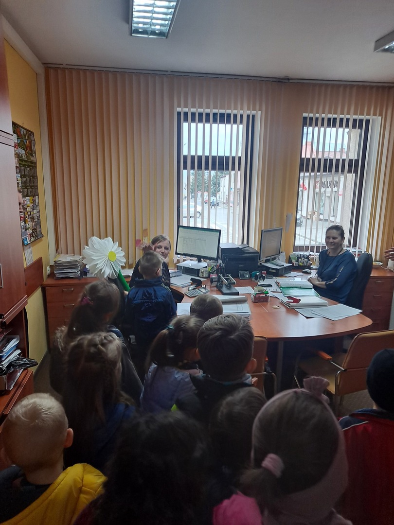 24 marca dzieci z grupy Pszczółki i Motylki udały się do Urzędu Gminy. Przywitała ich Pani wójt Dorota Makówka oraz Pani sekretarz Agata Wypych. Dzieci miały okazję zwiedzić Urząd i przyjrzeć się pracy na poszczególnych stanowiskach. Między innymi dowiedziały się gdzie można uzyskać informacje związane z segregacją odpadów. Poznały pracowników księgowości, opieki społecznej. Na końcu naszej wizyty mogły usiąść w fotelu Pani Wójt oraz własnoręcznie przybić pieczątkę.