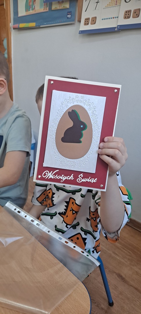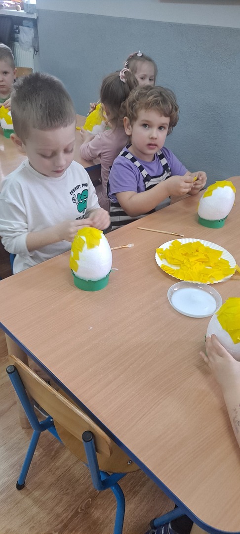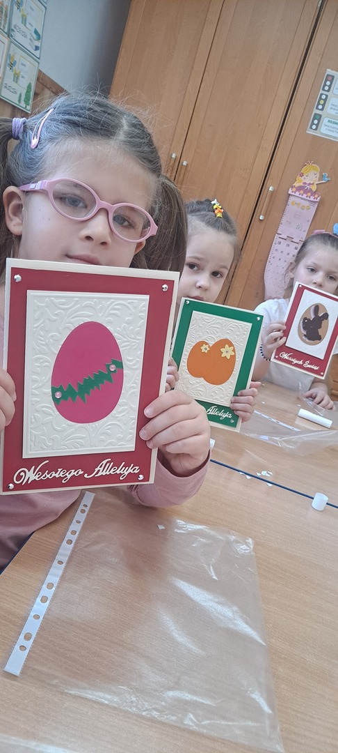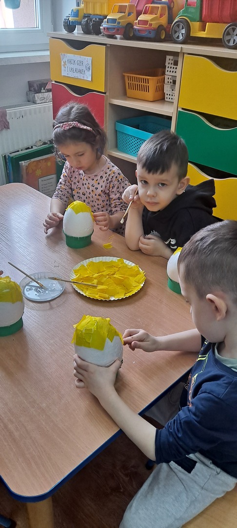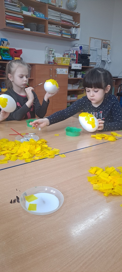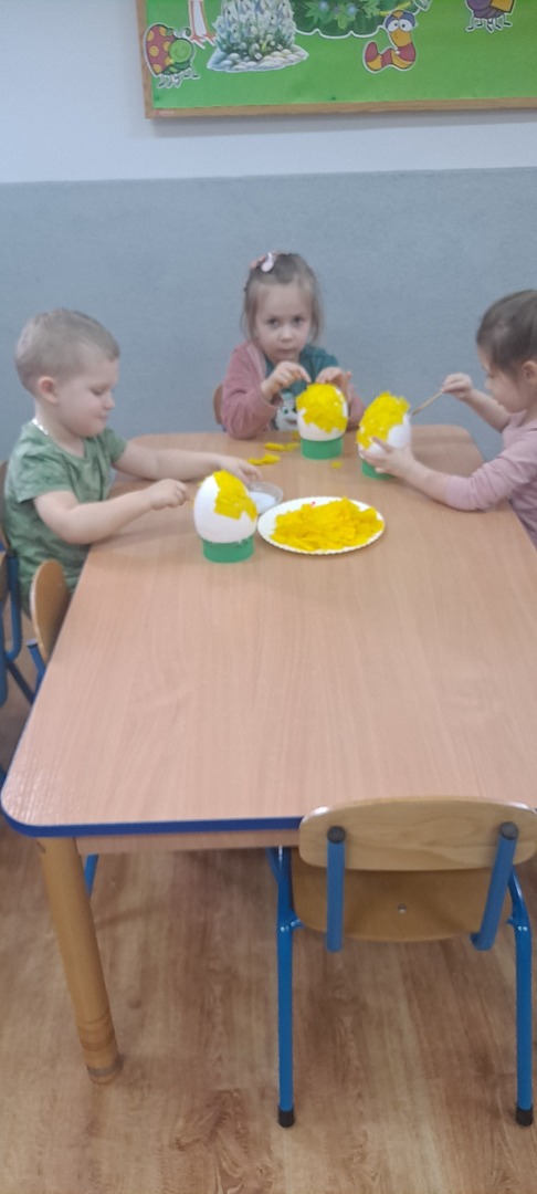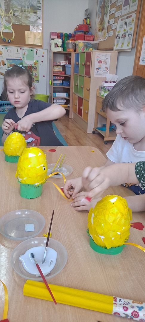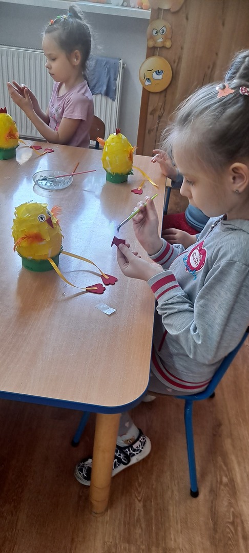 Dzieci same wykonywały wielkanocne kurczaki i świąteczne kartki z życzeniami. Było to bardzo trudne zadanie dlatego praca została rozłożona na dwa dni ale dzieci poradziły sobie świetnie ciesząc się z końcowego efektu.