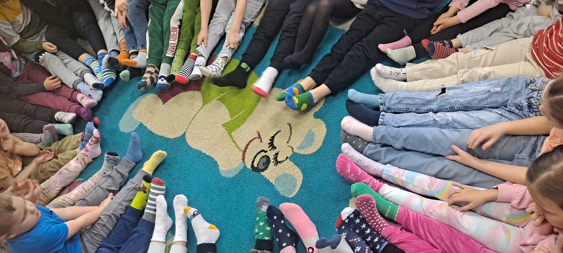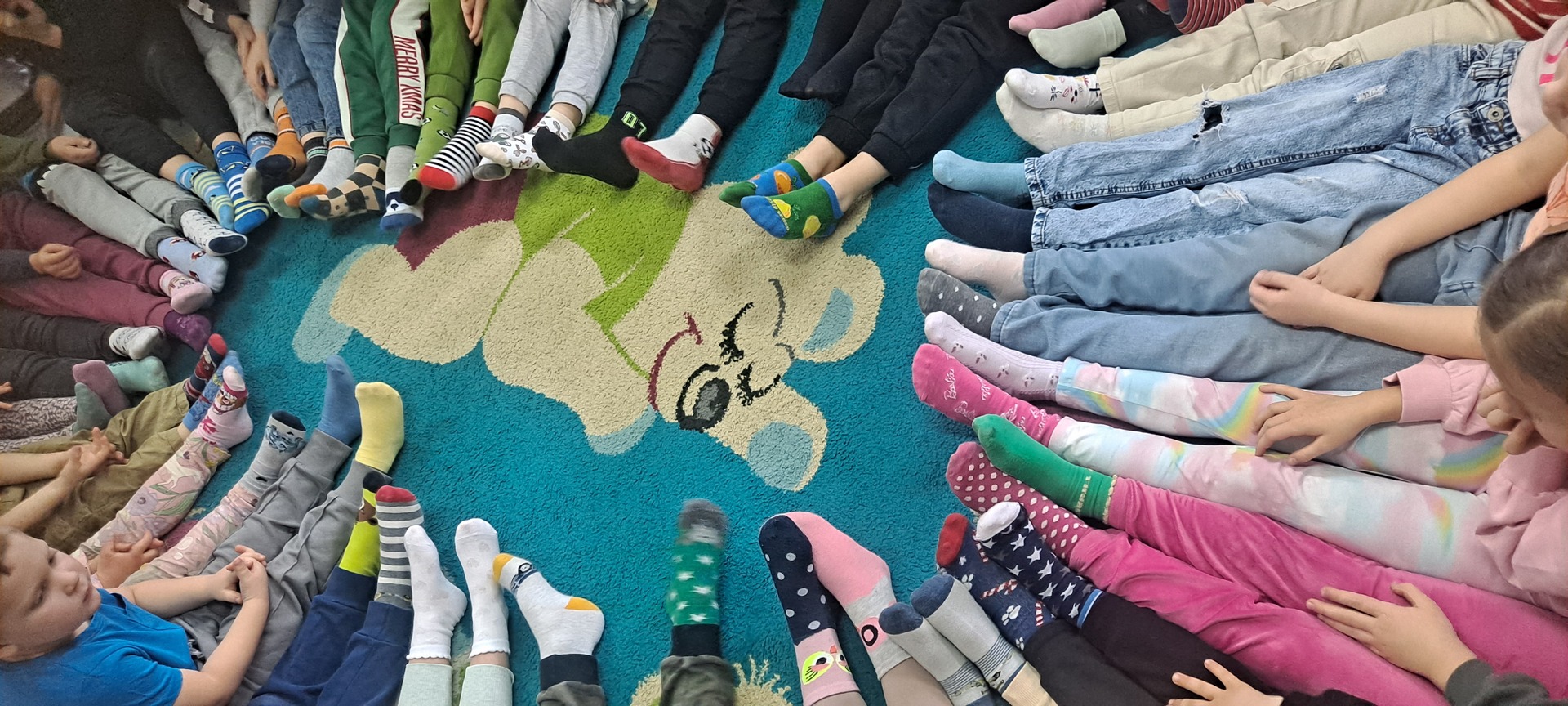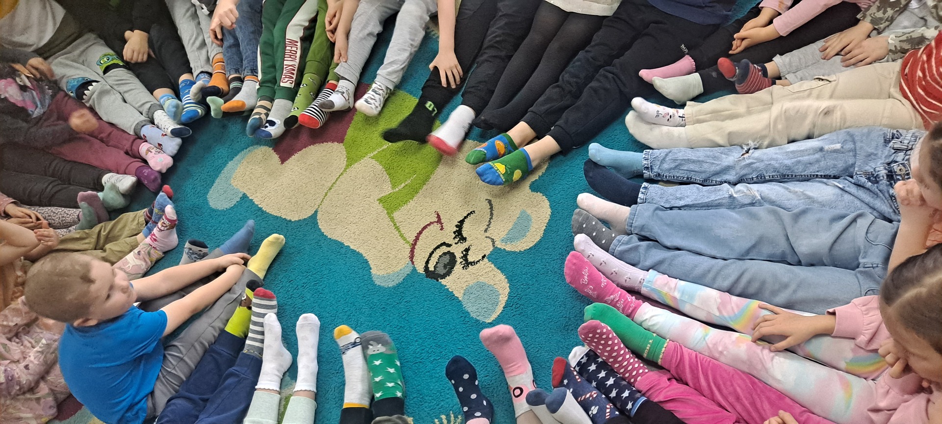 Przedszkolaki przyszły do przedszkola w dwóch różnych kolorowych skarpetkach. Poznały historię Fredzi oraz samodzielnie wykonały kolorową skarpetę.