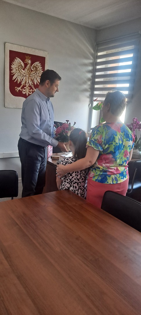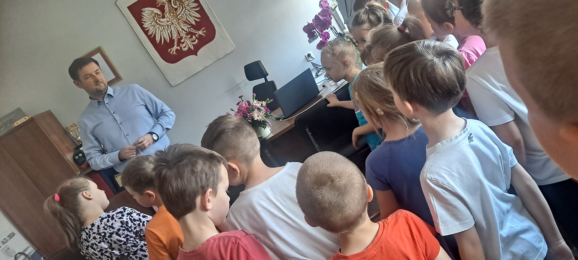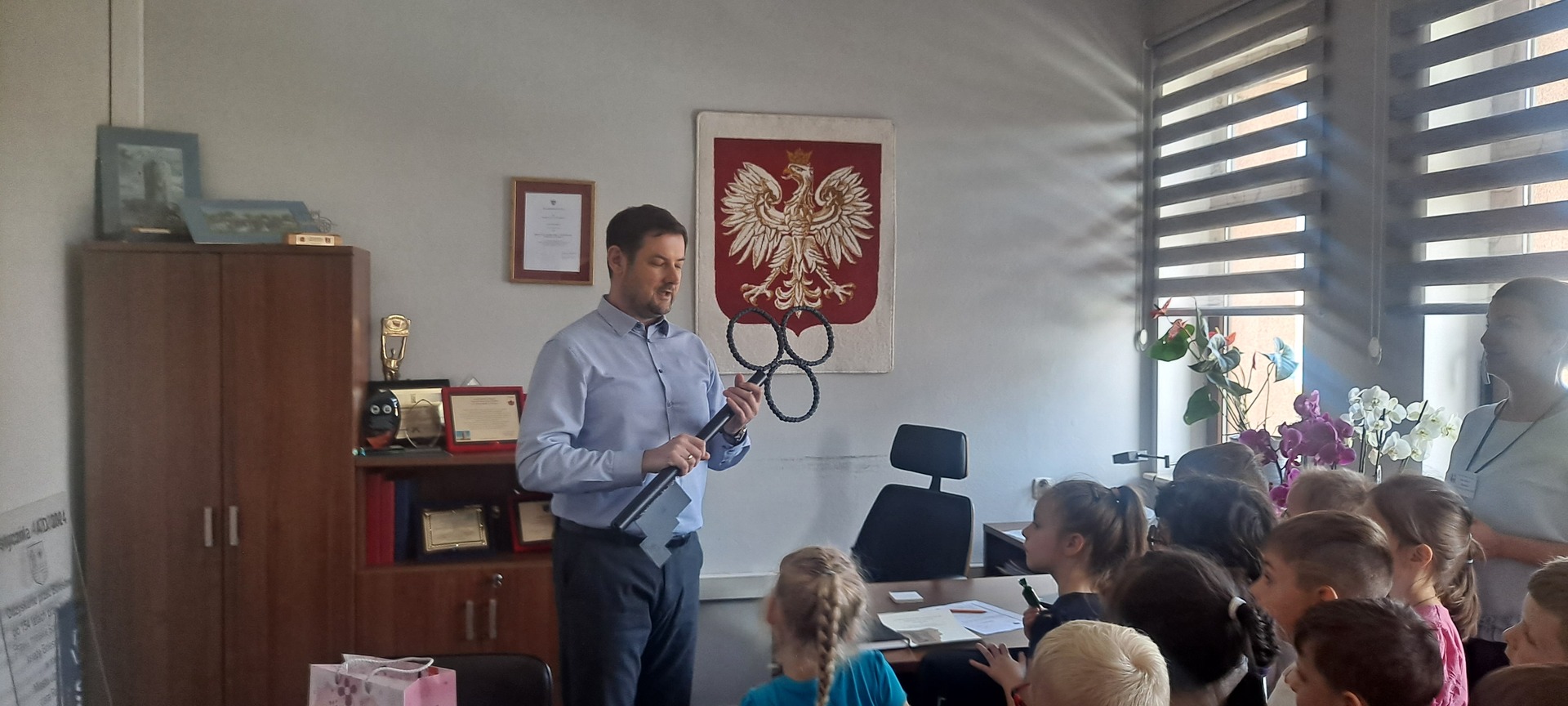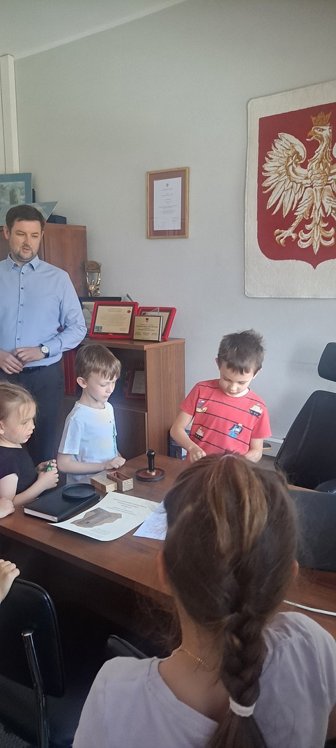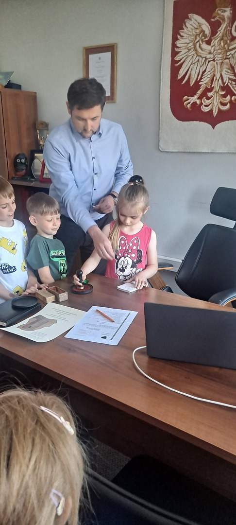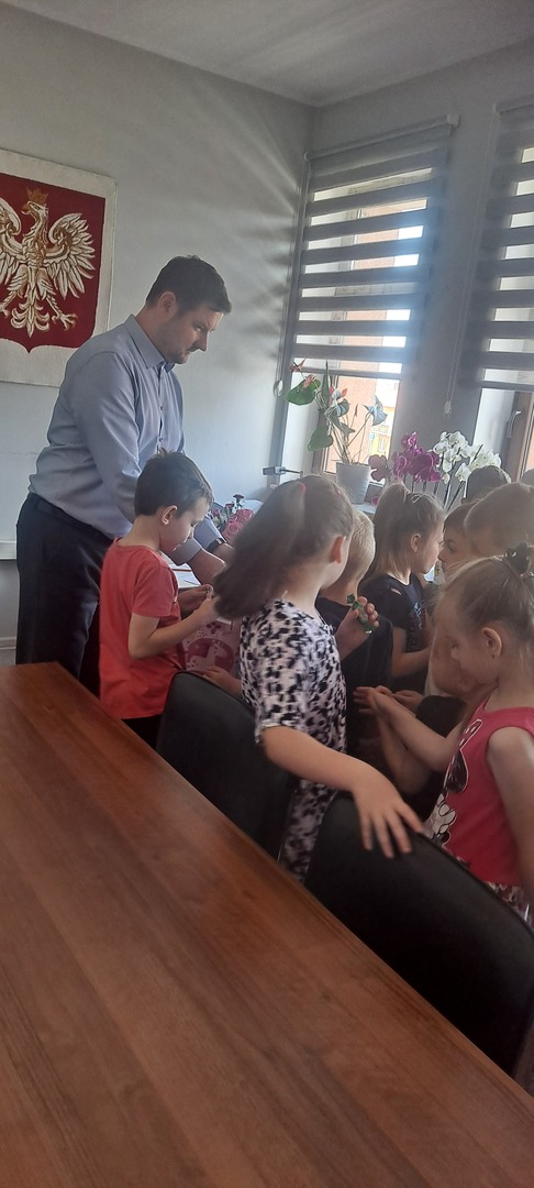 Włodarz miasta opowiedział najmłodszym o swojej pracy. Dzieciaki przez chwilę wcielili się w rolę burmistrza i z wielką chęcią zasiedli w fotelu włodarza miasta. Na zakończenie wizyty nie mogło zabraknąć pamiątkowych upominków, słodkości oraz wspólnej fotografii.