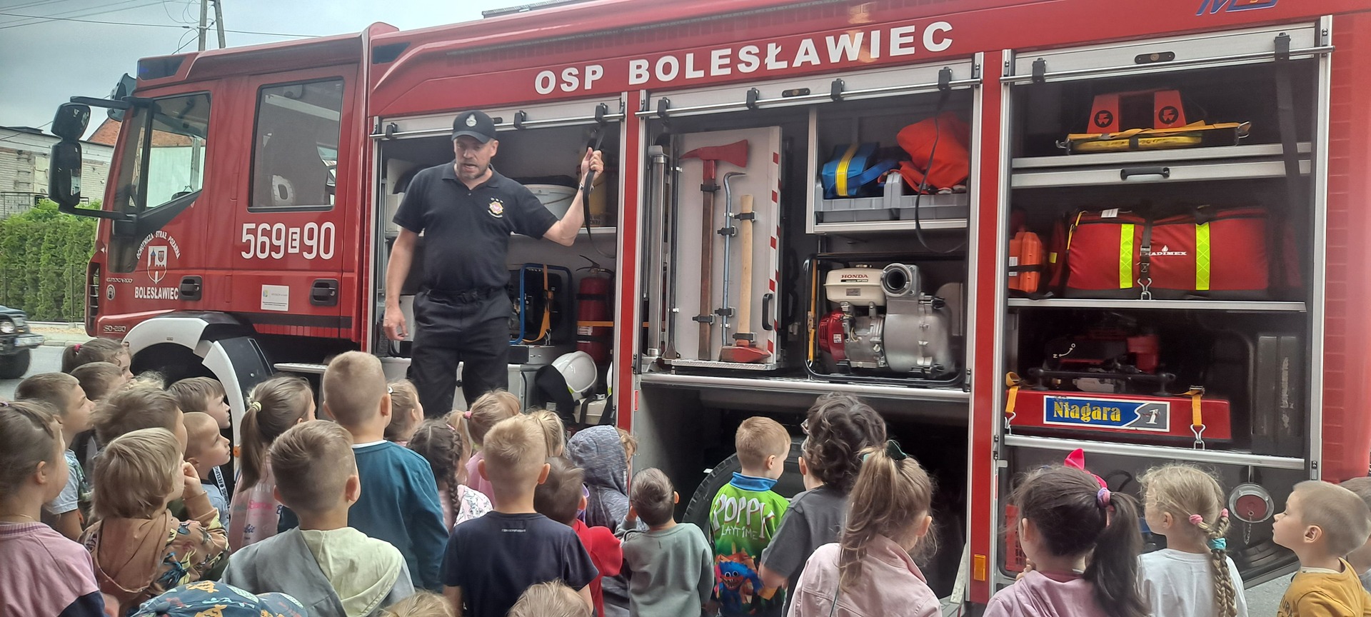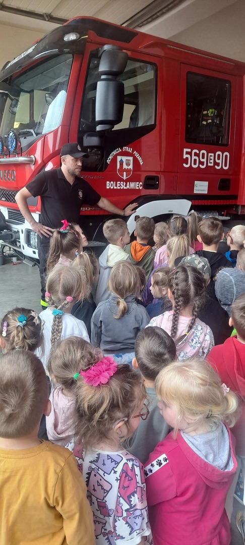 23 maja dzieci z naszego przedszkola odwiedziły jednostkę OSP Bolesławiec, aby zapoznać się z tajnikami pracy strażaka. Podczas wizyty został zaprezentowany sprzęt pożarniczy stanowiący wyposażenie jednostki. Dzieci mogły z bliska zobaczyć wóz strażacki i sprzęt pożarniczy, wysłuchały również opowieści o trudnej i niebezpiecznej pracy strażaka. Przedszkolaki dowiedziały się, w jakich okolicznościach można wezwać Straż Pożarną i że strażacy nie tylko gaszą pożary, ale również są wzywani do wypadków samochodowych, ratują zwierzęta, pomagają przy powodzi.