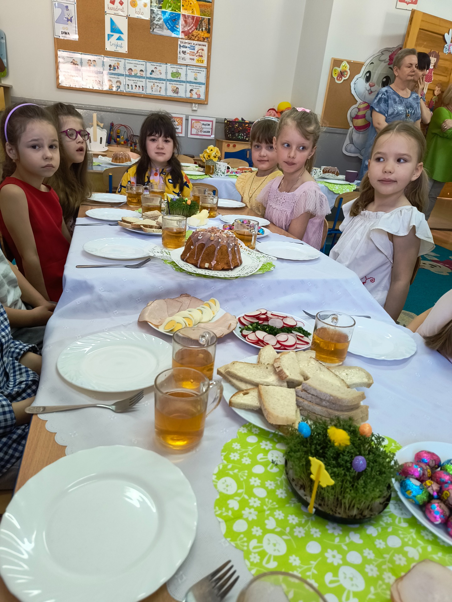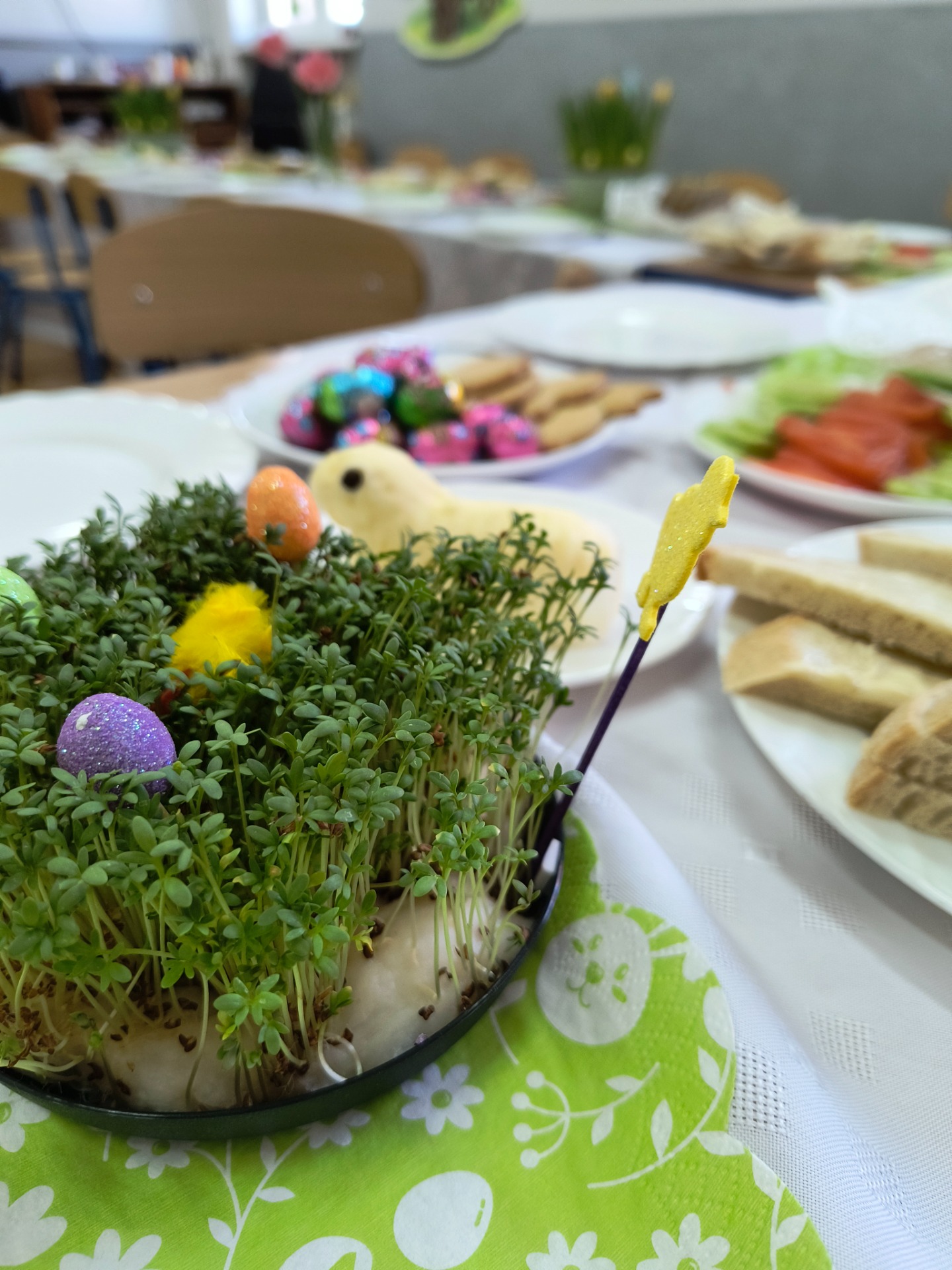 Śniadanie wielkanocne w naszym przedszkolu to piękna tradycja, która łączy dzieci w wyjątkowej atmosferze świątecznej radości i wspólnoty. Sale przedszkolne często dekorowane są wiosennymi akcentami – kolorowymi pisankami, kwiatami czy symbolami wielkanocnymi, takimi jak zajączki czy kurczaczki.