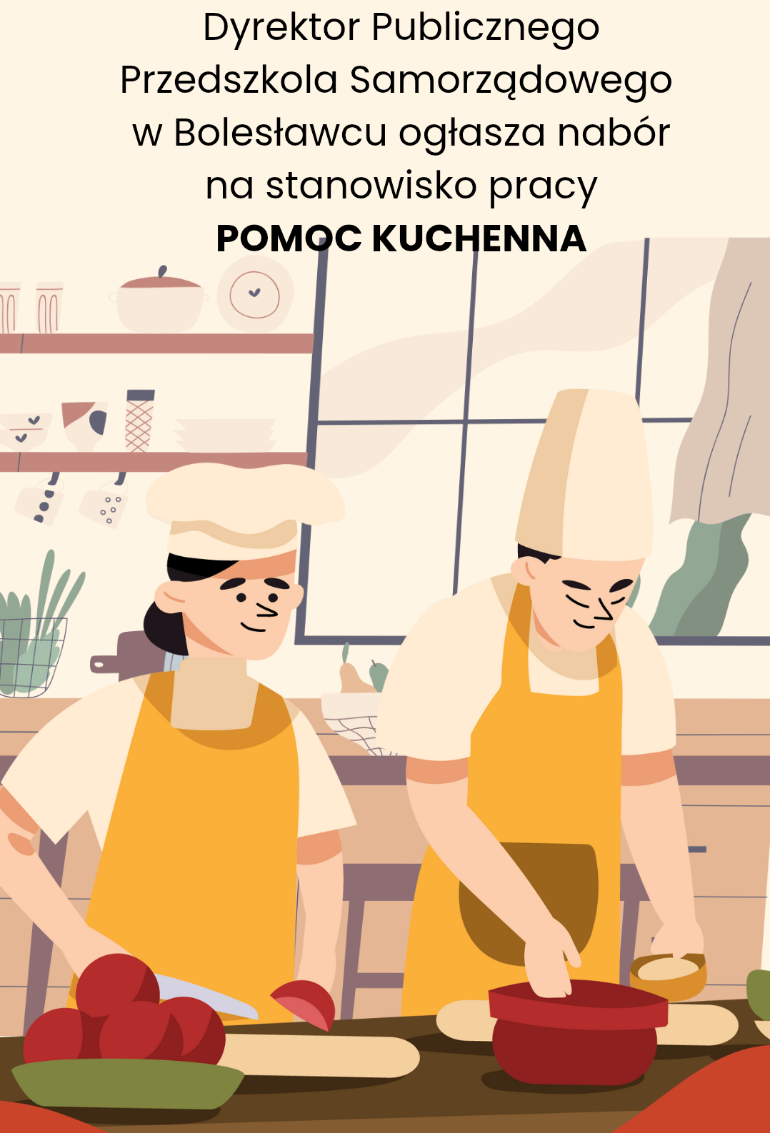 Dyrektor Publicznego Przedszkola Samorządowego w Bolesławcu ogłasza nabór na stanowisko pomocy kuchennej. Wszystkie informacje dotyczące naboru w załączniku nr 1.